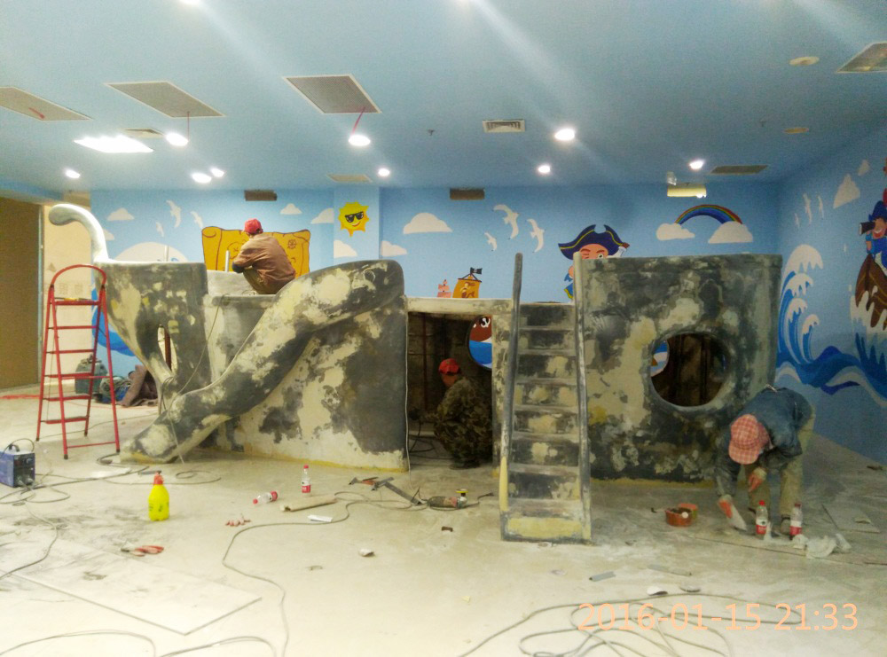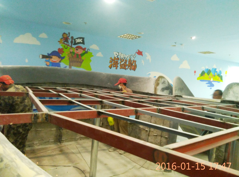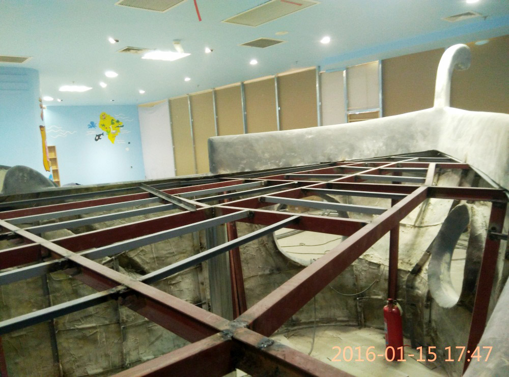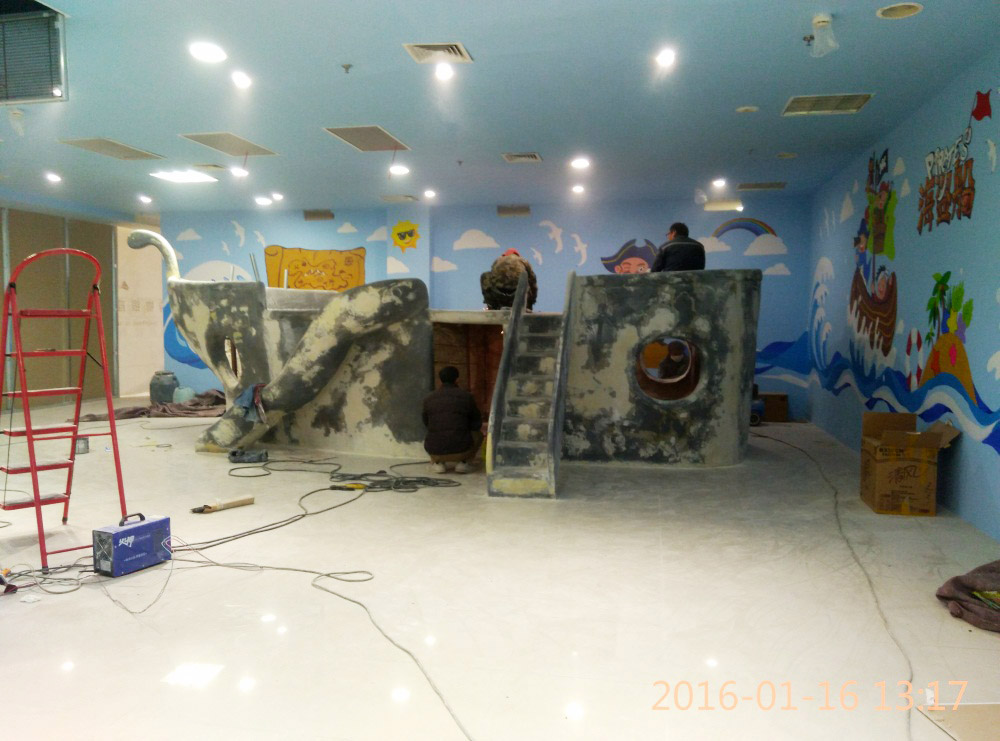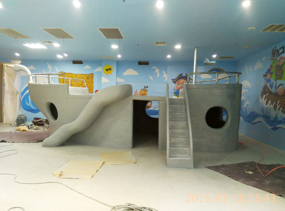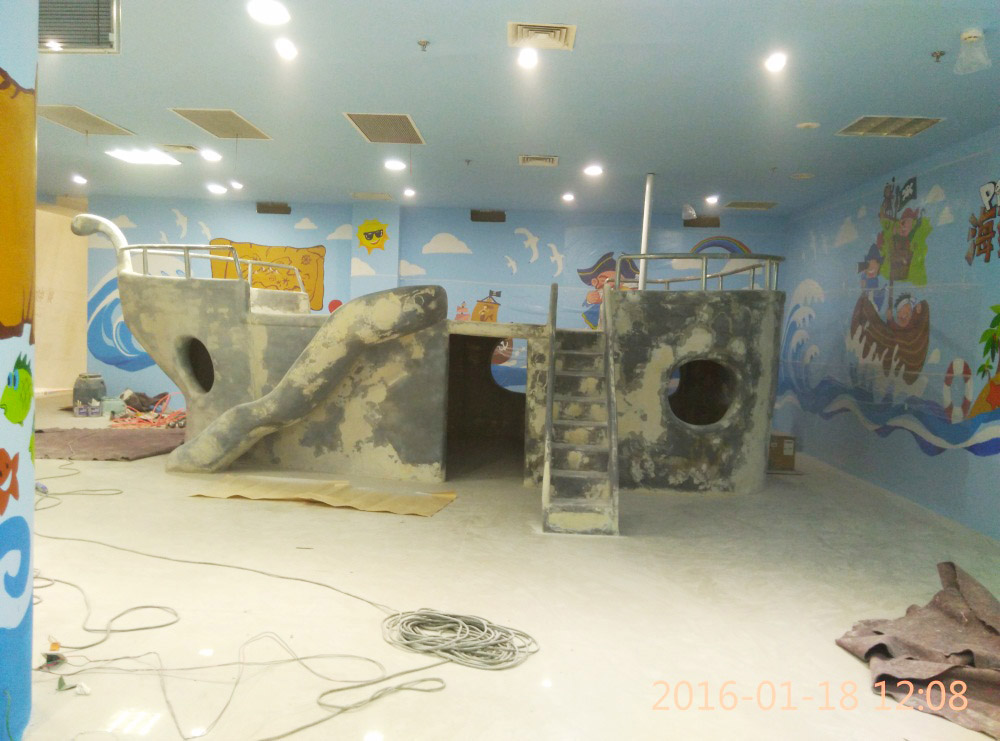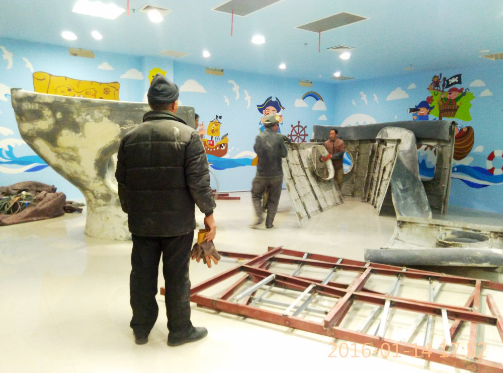 大型玻璃鋼游樂船雕塑竣工。2016年1月15-1月19日安裝于山東省濱州市黃河五路渤海十路銀座商城黃河店四樓。