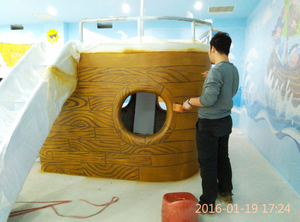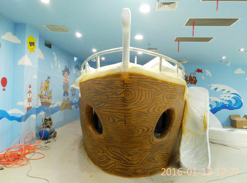 大型玻璃鋼游樂船雕塑竣工。2016年1月15-1月19日安裝于山東省濱州市黃河五路渤海十路銀座商城黃河店四樓。