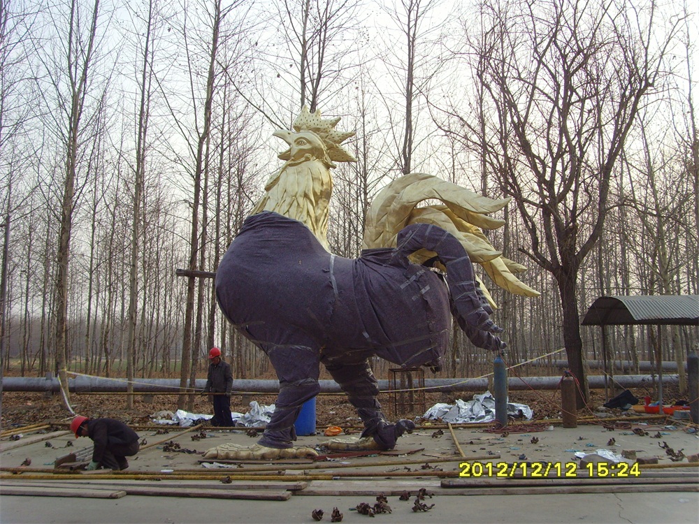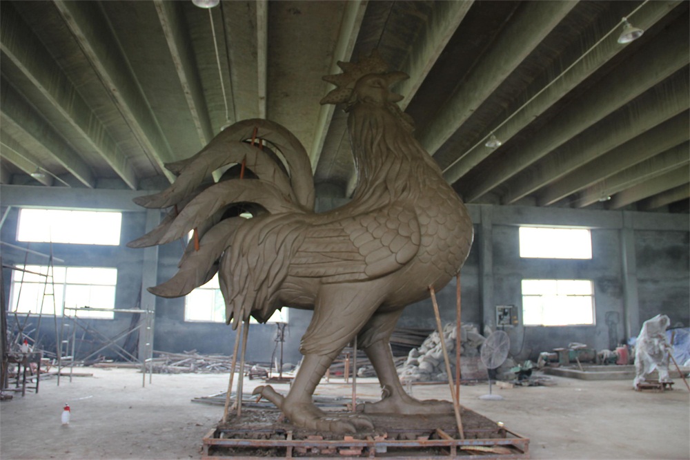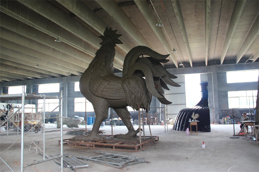 金雞雕塑高5米,為錫青銅鑄造,表面采用傳統(tǒng)的鎏金工藝全部鎏金,共用黃金6850克。為目前國內(nèi)最大的鑄銅鎏金雕塑。