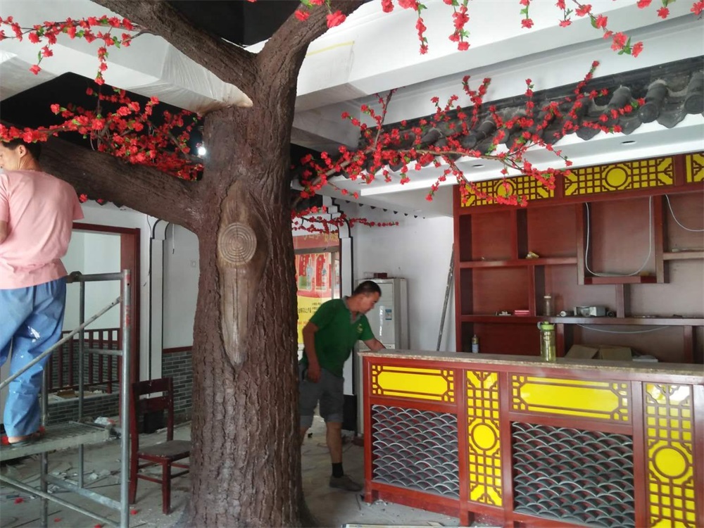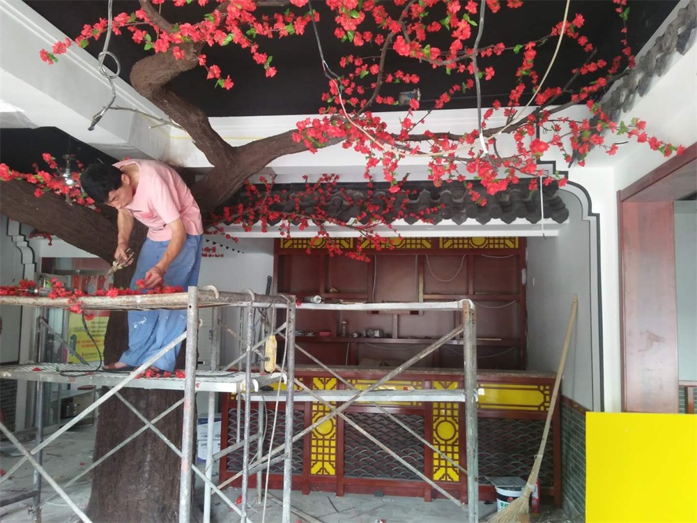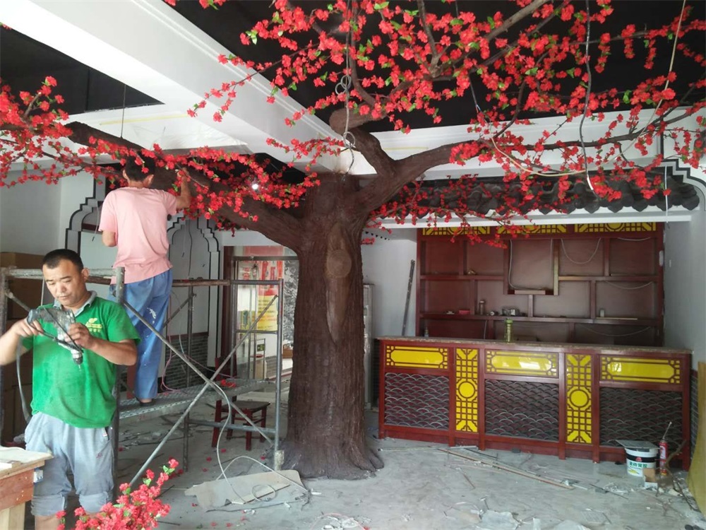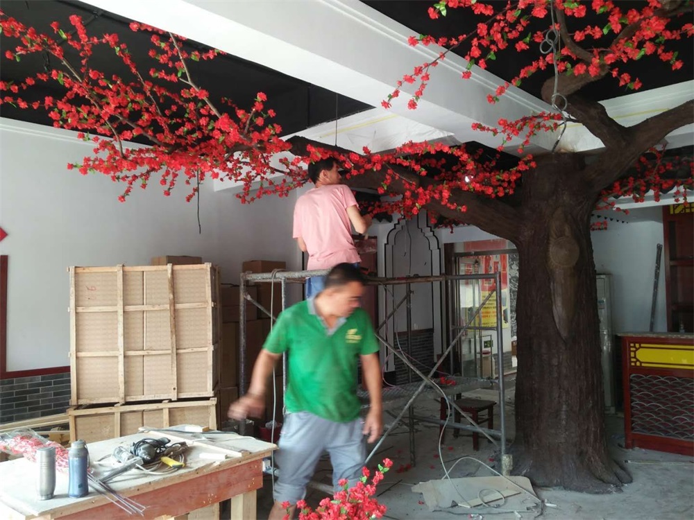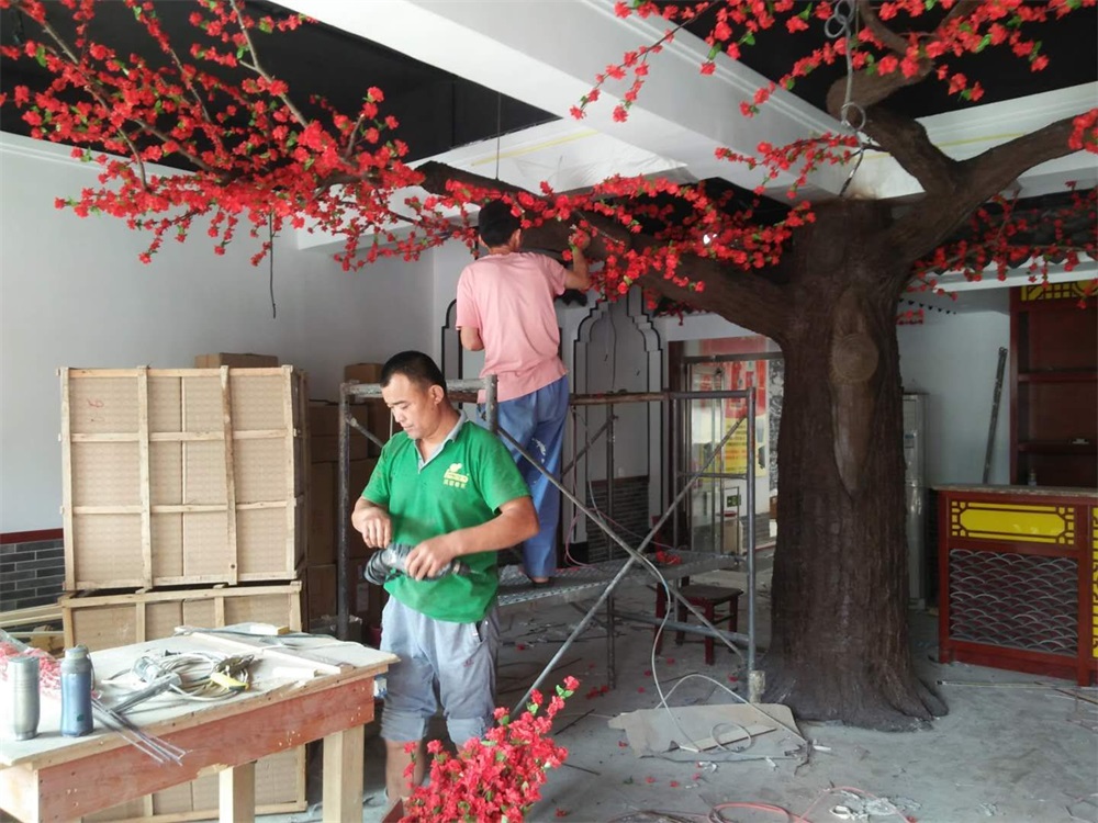 項(xiàng)目說明:假樹的樹干及主要枝干采用水泥直塑成型,樹葉和花采用絹布仿真花葉工藝。整體高度3米,樹冠直徑4.5米。
