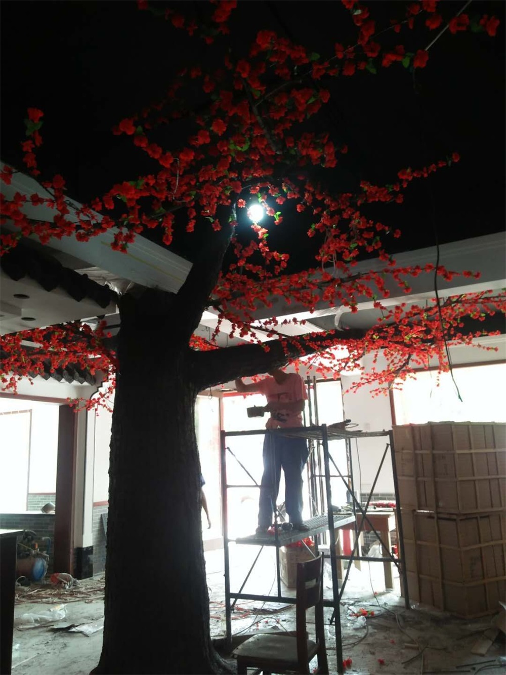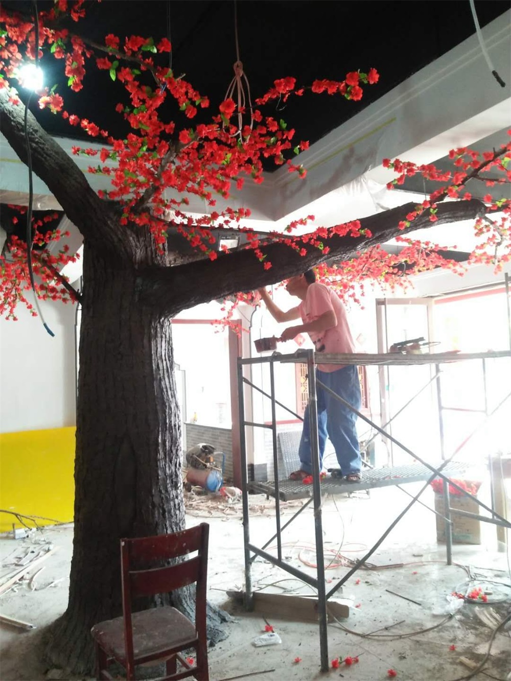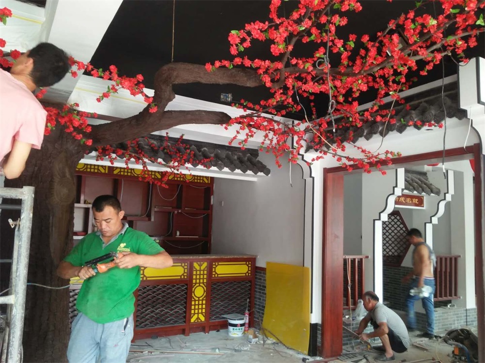 項(xiàng)目說明:假樹的樹干及主要枝干采用水泥直塑成型,樹葉和花采用絹布仿真花葉工藝。整體高度3米,樹冠直徑4.5米。