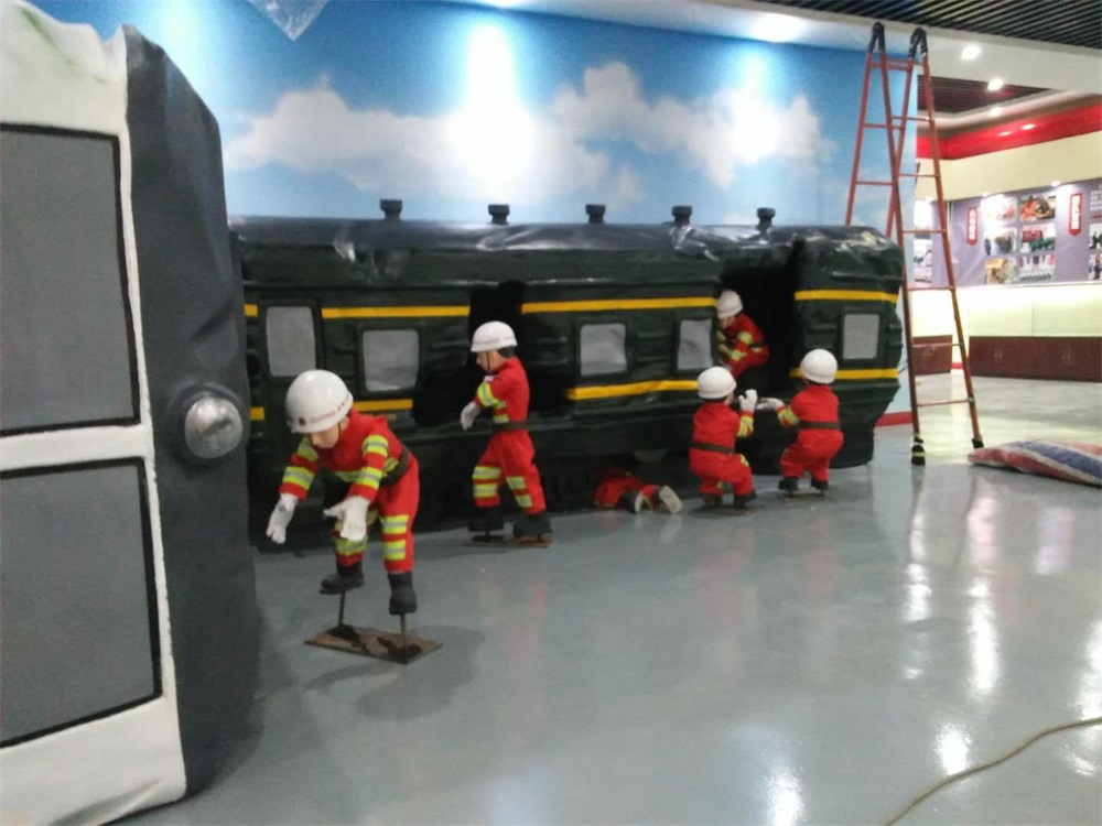 雕塑說明:雕塑整體場景以發(fā)生在淄博市境內(nèi)的一場火車碰撞事故救援現(xiàn)場為題材?;疖嚹P筒捎门菽袼芄に囍谱鳎砻娌世L。消防人物雕塑采用玻璃鋼雕塑工藝制作。