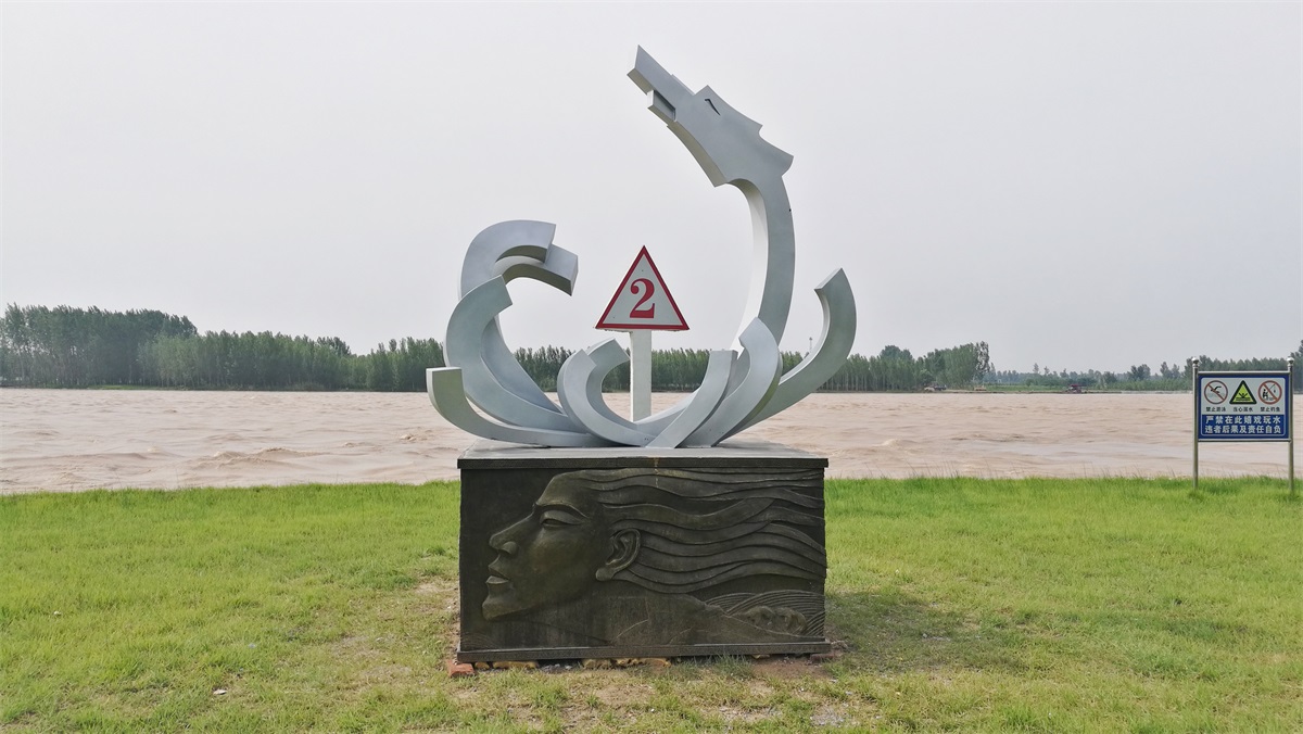 “黃河龍”象征黃河母親哺育中華民族生生不息,奮勇向前;也象征從古至今中華民族不屈不撓同黃河水患斗爭(zhēng)的偉大精神;雕塑各分支代表黃河支流匯集,驚濤駭浪,氣勢(shì)雄渾。浮雕部分以黃河河道全貌貫穿四面,配以古今抗洪搶險(xiǎn)的偉大事跡。