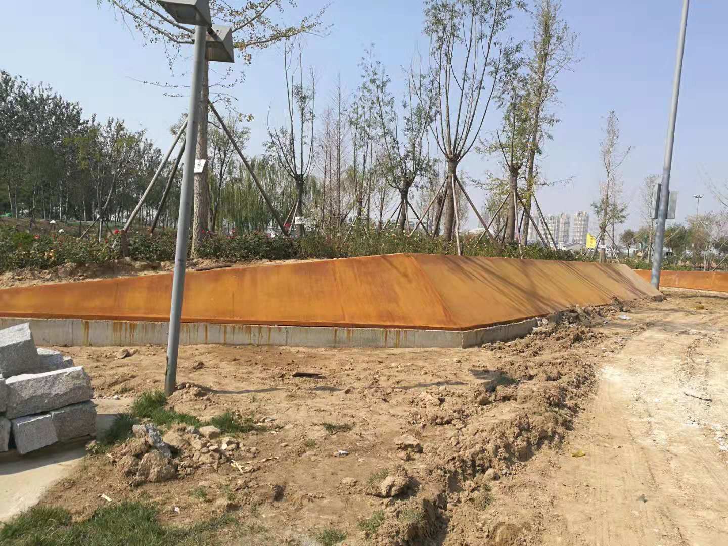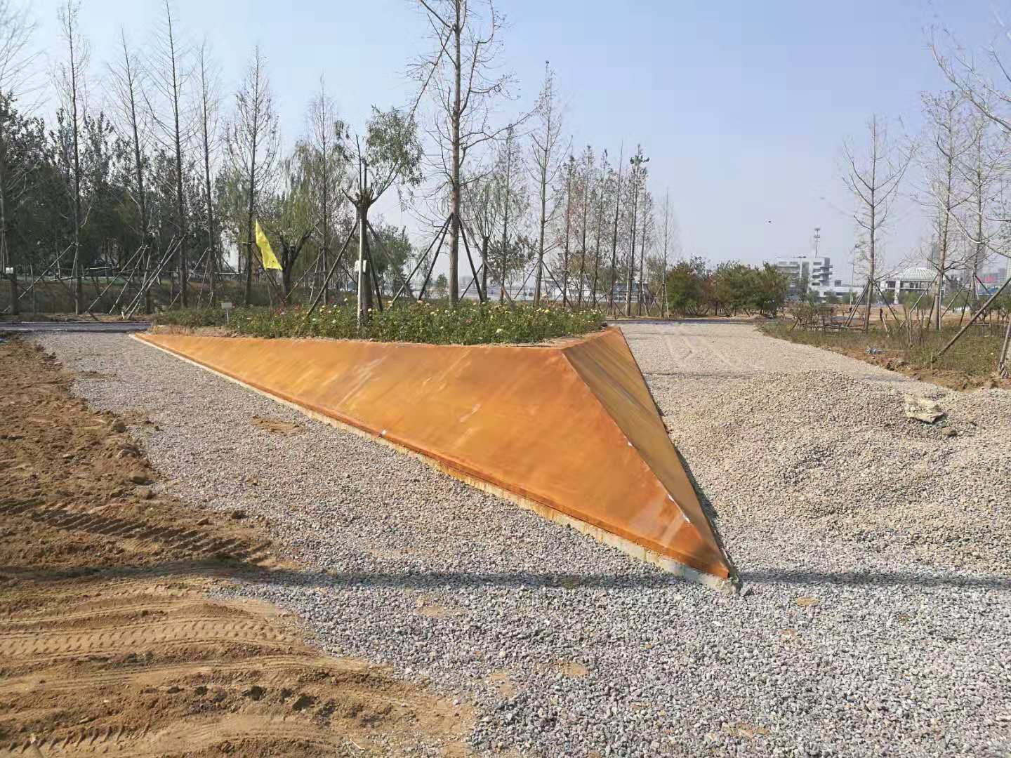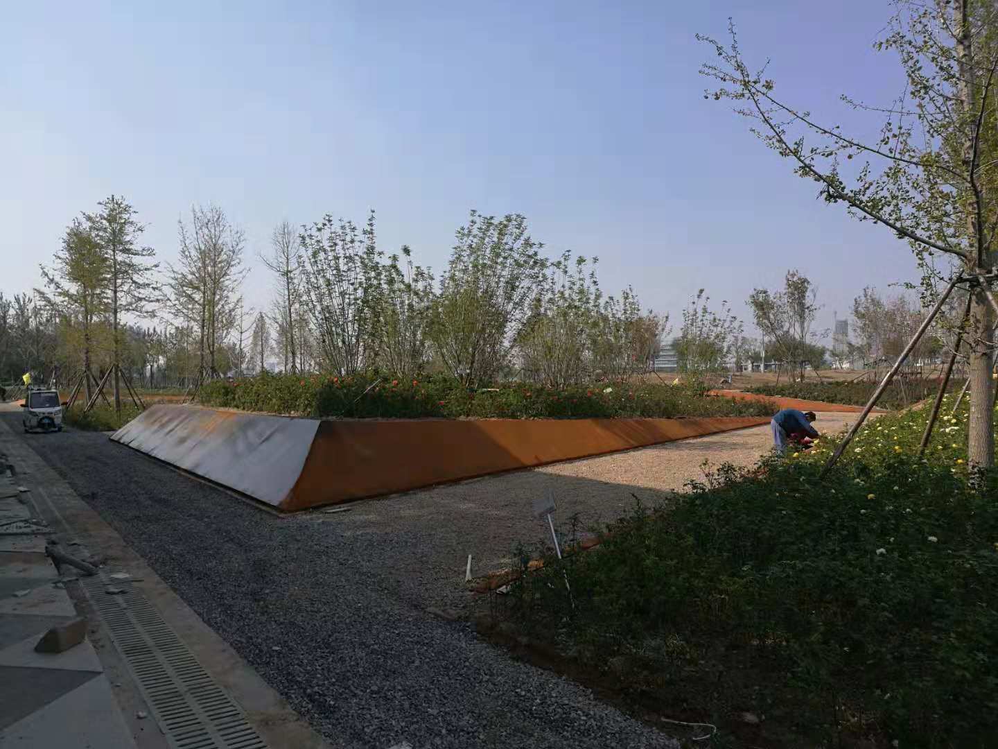 中海植物園即原來的中海景區(qū)東北角的原高爾夫球場區(qū)域,2018年改造升級為濱州中海植物園。所施工的銹板花池共7組,造型表面積共488平方米。造型板采用5mm厚銹板,支撐采用80mm*50mm*2.5mm的U形鋼。采用專業(yè)的耐候鋼生銹劑及固銹劑做表面處理。生銹的初期會呈黃色,然后隨著生銹進(jìn)程的推移,逐漸顯現(xiàn)金黃色,橙黃色,橙色,橙紅,紅褐色最后在紅褐,或者褐色穩(wěn)定下來。