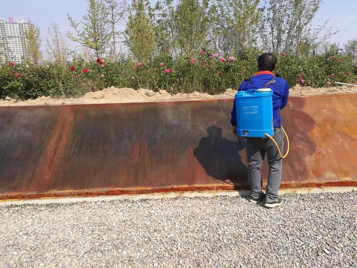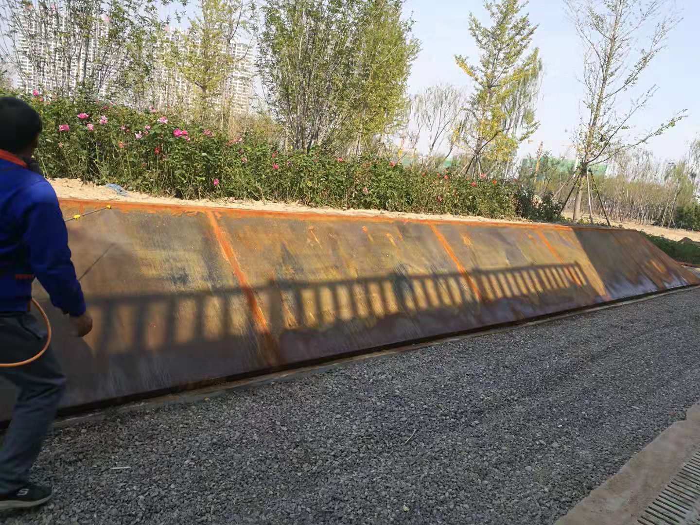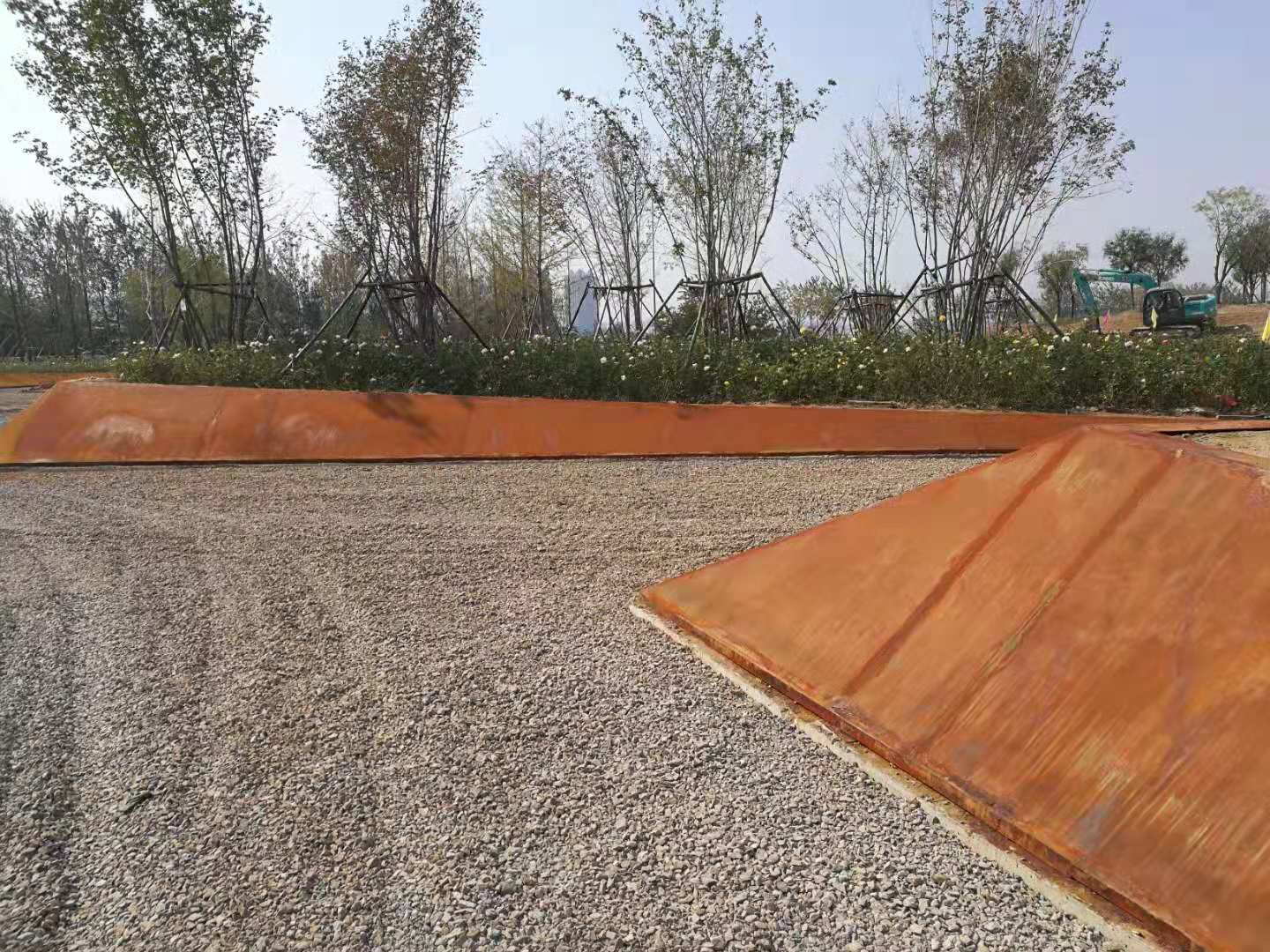 中海植物園即原來的中海景區(qū)東北角的原高爾夫球場區(qū)域,2018年改造升級為濱州中海植物園。所施工的銹板花池共7組,造型表面積共488平方米。造型板采用5mm厚銹板,支撐采用80mm*50mm*2.5mm的U形鋼。采用專業(yè)的耐候鋼生銹劑及固銹劑做表面處理。生銹的初期會呈黃色,然后隨著生銹進(jìn)程的推移,逐漸顯現(xiàn)金黃色,橙黃色,橙色,橙紅,紅褐色最后在紅褐,或者褐色穩(wěn)定下來。